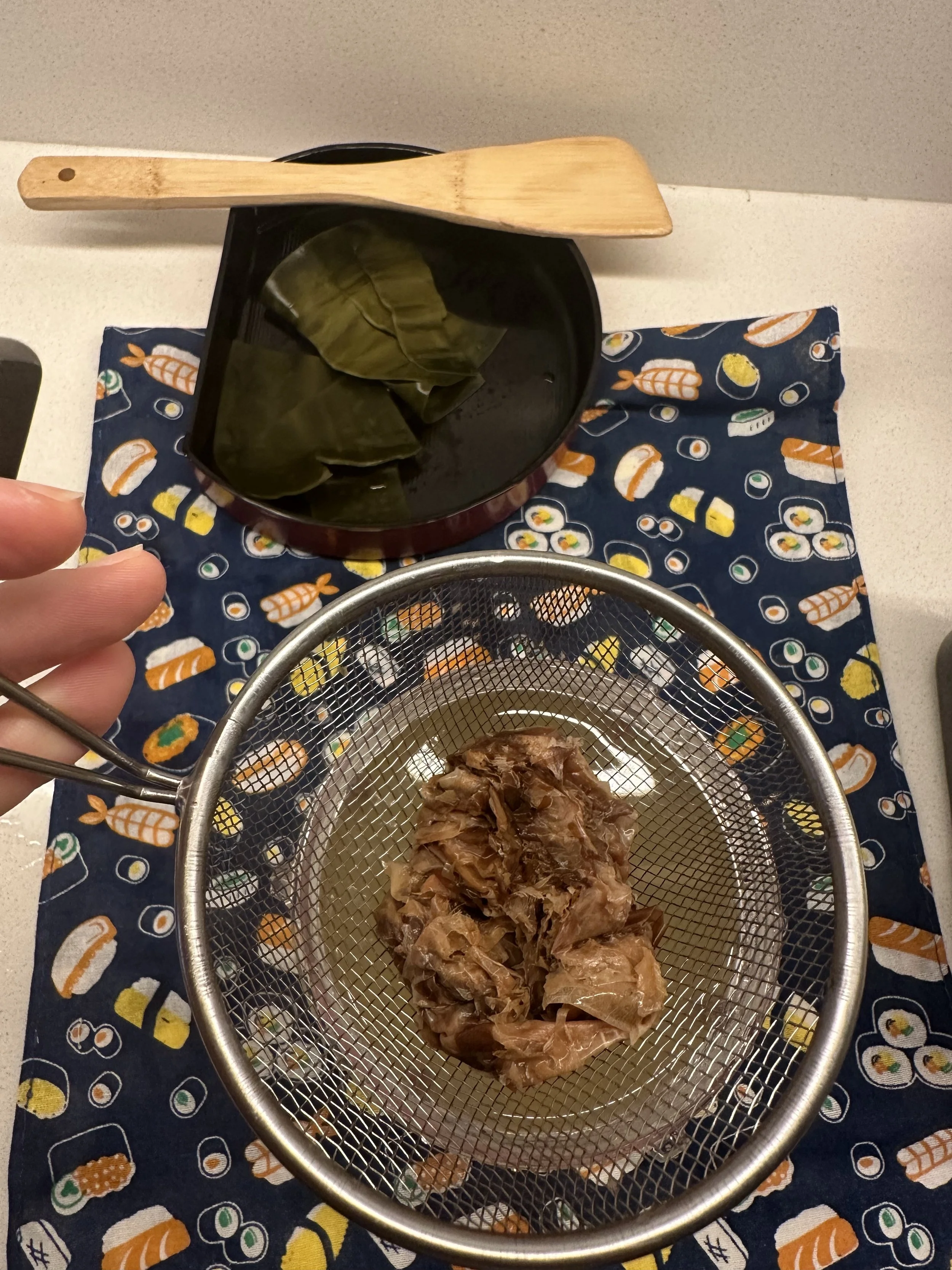 Colar el dashi: Retira del fuego y cuela el caldo, eliminando los sólidos. El dashi está listo para usar.